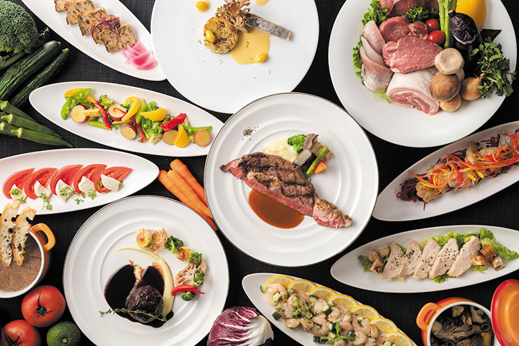 オードブル、スープ、本日のお料理、サラダ、パン、デザートはブッフェコーナーよりお好きなだけお召し上がりいただけます。メイン料理は、お肉かお魚をお選びいただけます。バラエティー豊かなお料理をお楽しみください。